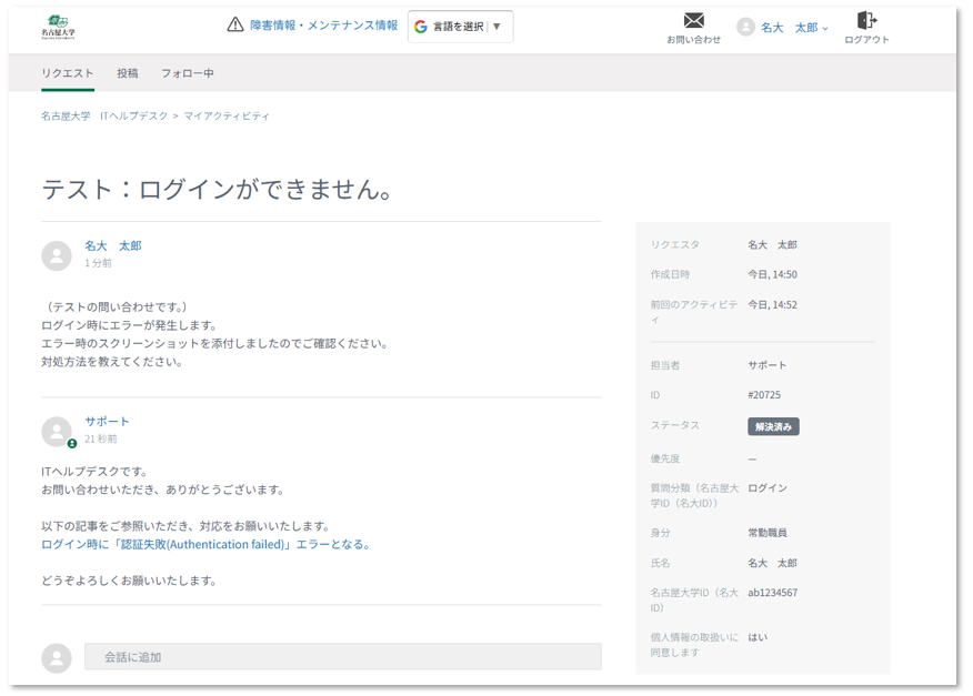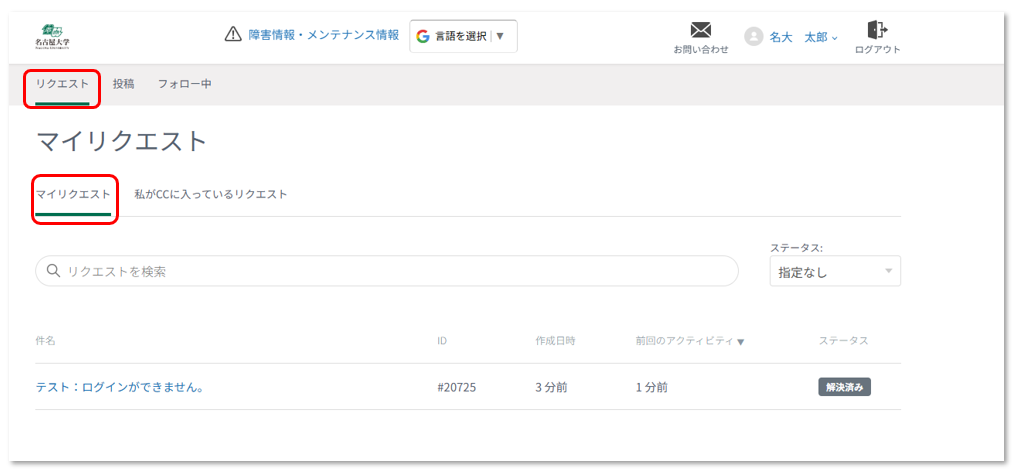 - 「リクエスト」>「マイリクエスト」からお問い合わせ状況をご確認いただけます。